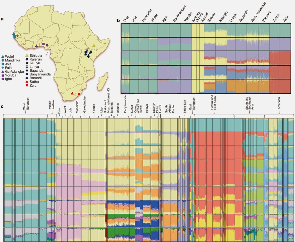 «África ha sido identificado como la parte del mundo donde el nivel de la variación genética humana es mayor y los estudios genómicos han confirmado también que las poblaciones africanas tienen los menores niveles de desequilibrio de ligamiento (Reich et al, 2001).