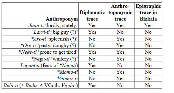 Prehipótesis 2. Una vez que el euskera penetró en la Llanada alavesa, probablemente en el siglo VI, este tronco antroponímico se enriqueció con varios antropónimos nuevos: algunos latinos, otros paleohispánicos de origen oscuro, algunos visigodos, además apelativos comunes vascos que, por onomatización, se convirtieron en antropónimos.